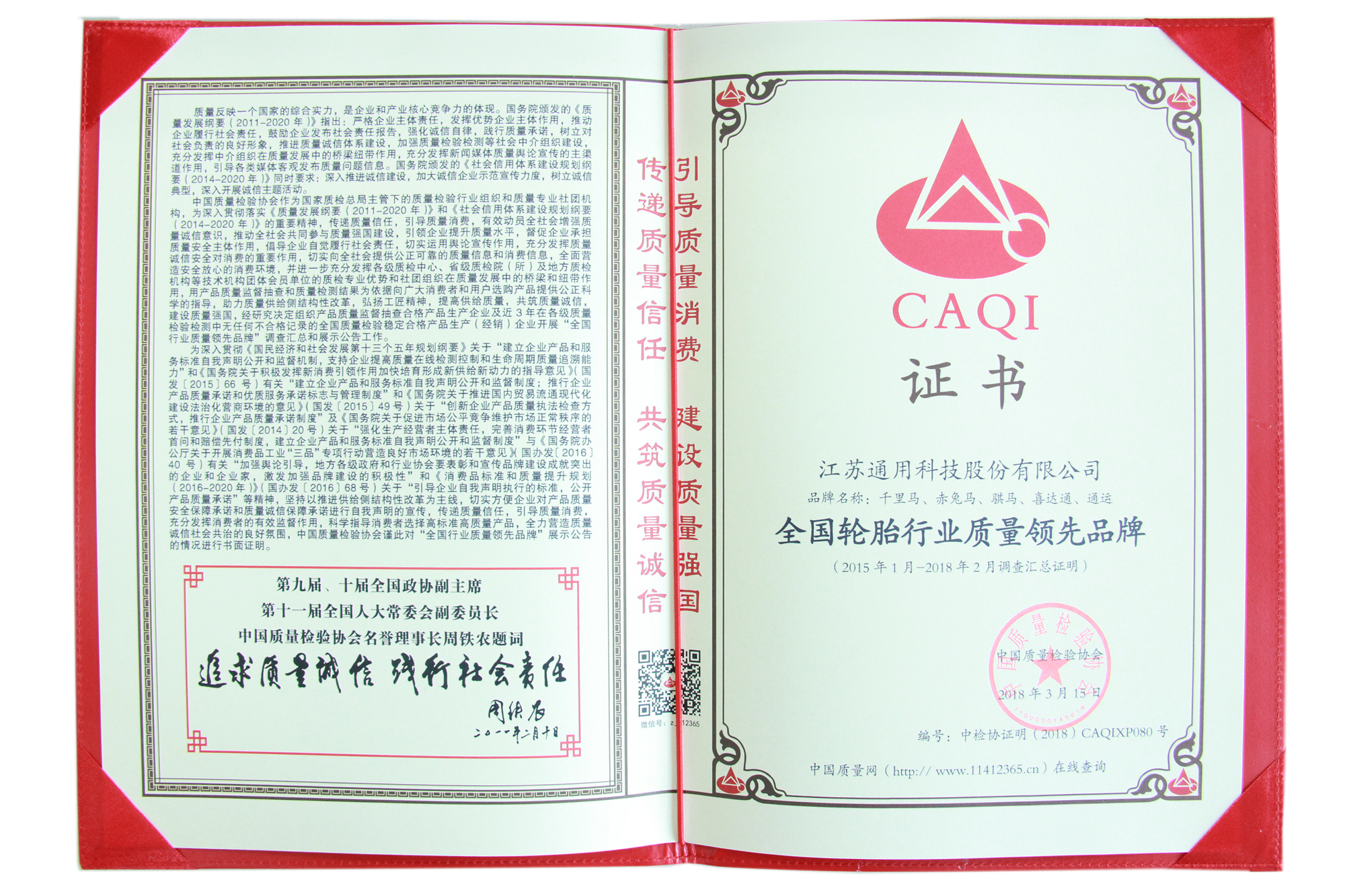 近日,在由國家質檢總局和中國質量檢驗協會聯合開展的“產品和服務質量誠信承諾”主題活動中,通用股份榮獲“全國產品和服務質量誠信示范企業(yè)”、“全國輪胎行業(yè)質量領先品牌”稱號。